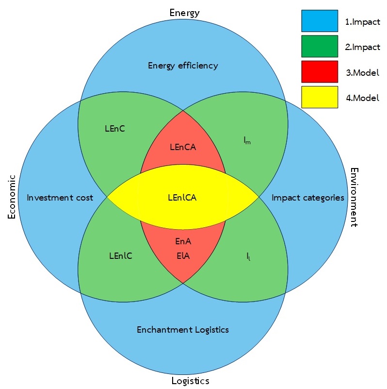 Energy costing per life cycle assessment (EnA, USD/kg emission-eq) Single score per functional unit (Im,Pd, 1Unit, Pt) Energy, logistics, and environmental impact Energy costing per LCA and logistics (ElnA, USD/kg-km emission-eq) Single score per functional unit of Climate change (Ilcc, Pd, 1Unit, Pt) |
